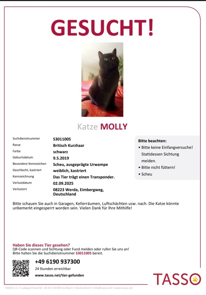 Ich vermisse meine Molly leider seit nun mehr 4 Wochen.. Keiner weiß wo sie sich aufhält oder hat sie gesehen 🥲 Molly, 6 Jahre, kastriert, gechipt und bei Tasso registriert, scheu und ängstlich bei lauten Geräuschen, auffällig sind die verkürzten Beine und die stark ausgeprägte Urwampe, Molly trägt lediglich ein Zeckenband, kein Halsband. Nicht auffindbar seit 02.09.25 09.30 Uhr, Eimbergweg, 08223 Werda