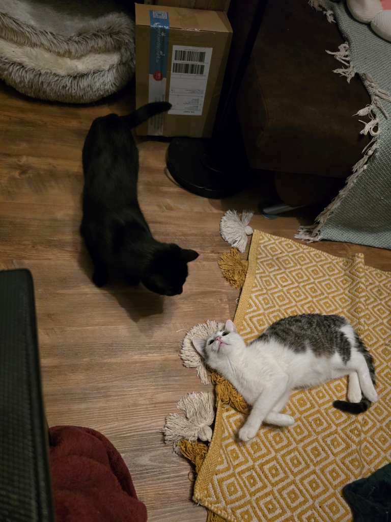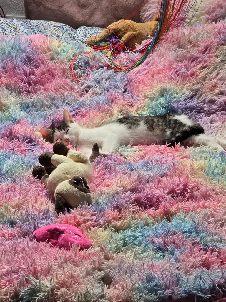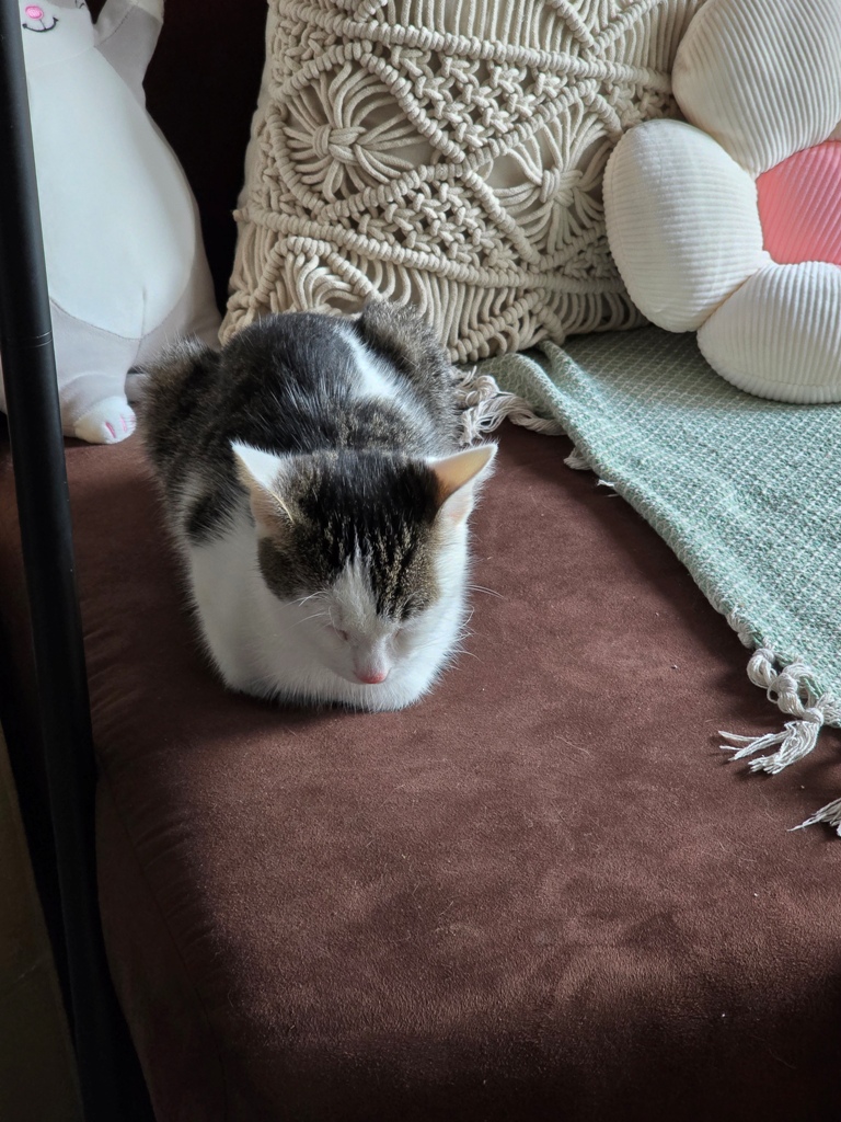 Schon eine Woche ist es her (Mitte Oktober 2025), dass die kleine Frida aus dem Tierheim Plauen zu mir nach Hof gezogen ist. Erst war sie sehr verwirrt, scheu und hat nachts bitterlich geweint im Unbekannten. Sicherlich half es nicht, dass meine Katze Hel erst gar nicht begeistert war von dem Kätzchen das ich da mitbrachte. Was die geknurrt und gebrummt hat, ich dachte sie sei spontan ein Bär geworden! Doch bereits am 3. Tag kehrte langsam Ruhe ein, man frass sogar nebeneinander aus dem selben Napf und schlief sogar mit Abstand in der Nähe von einander. Zwar fetzen sich die zwei noch ab und zu, doch immer nur sehr kurz und Frida sagt schon was ihr zu weit geht und was okay ist. Zu mir wird die kleine Frida auch immer zutraulicher. Sie lässt sich bereits streicheln und kraulen, schnurrt dabei wie ein angesprungenes Motorrad und schläft gerne in meiner Nähe. Alles in Allem würde ich sagen, fühlt sie sich wohl und wird sich bestimmt bald komplett heimisch fühlen. Liebe Grüsse